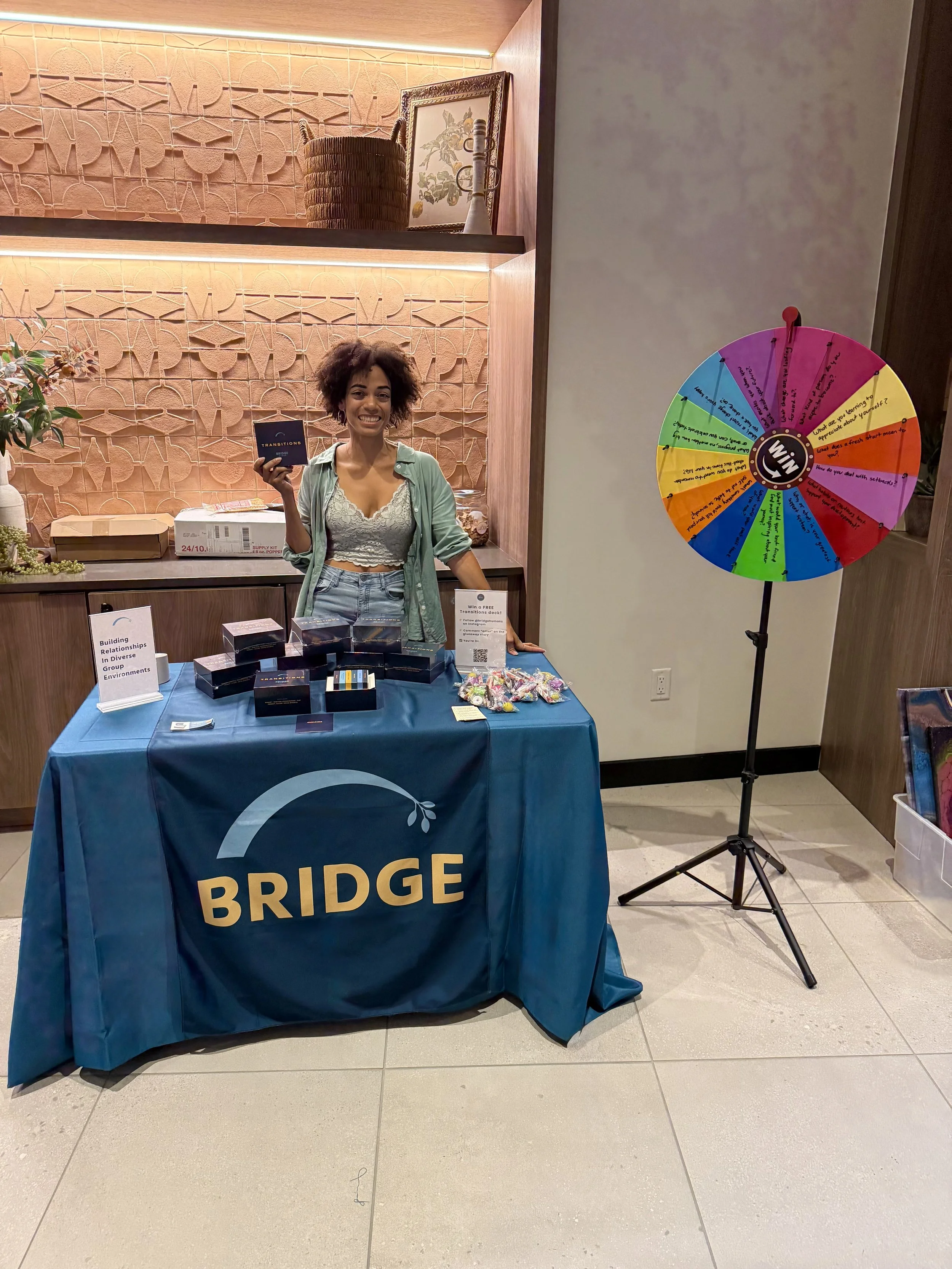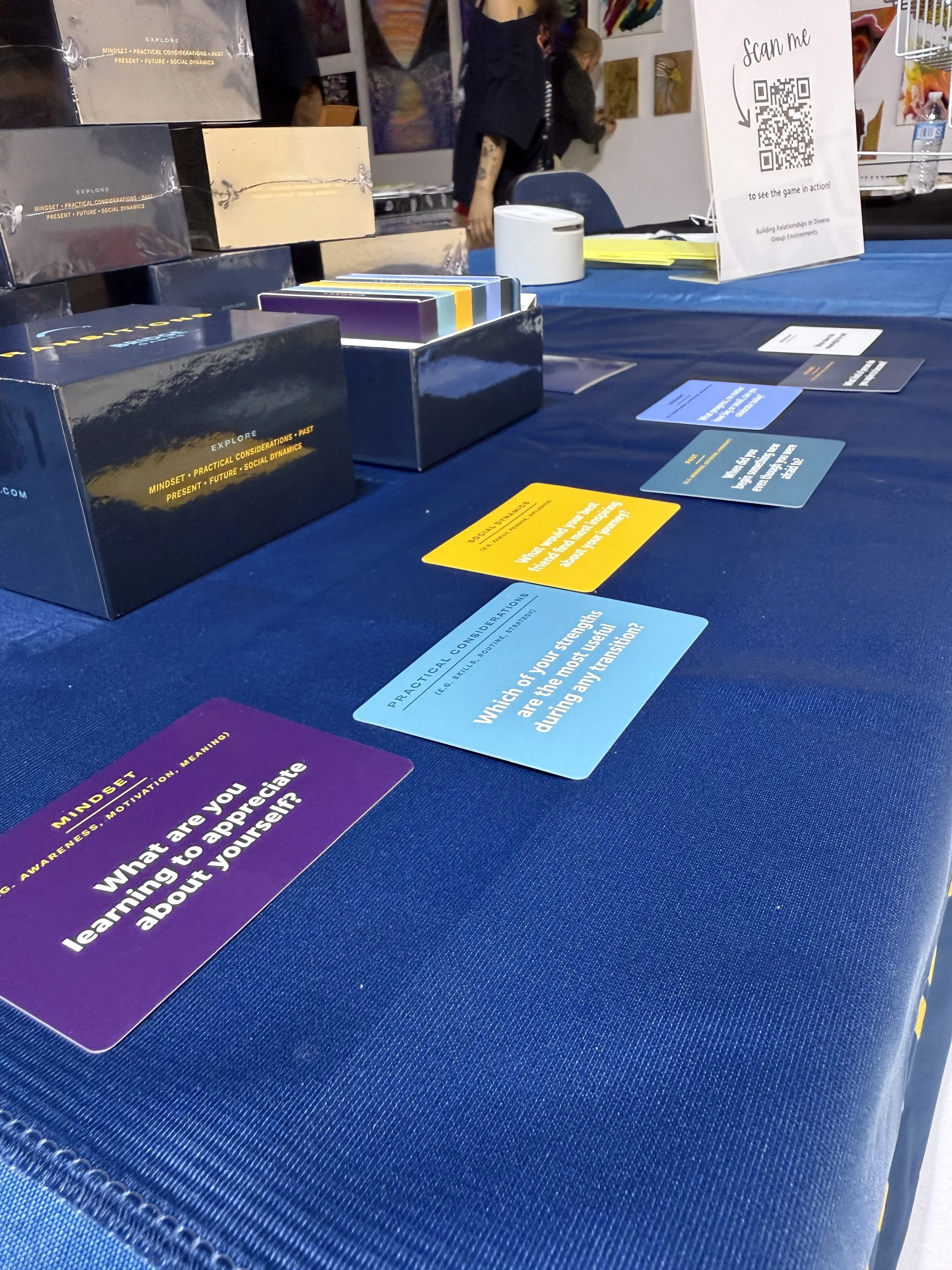 Transitions made its tabling debut here in Denver at First Friday in the Santa Fe Art District and the Aquí Art Show! I had such a blast tabling at both events. My setup was full of ways to spark conversation: the Transitions card game, a prize wheel with questions from the deck, and plenty of space to chat and connect. I loved seeing people stop by to engage with the game, bond over shared experiences, and take home a deck of their own.