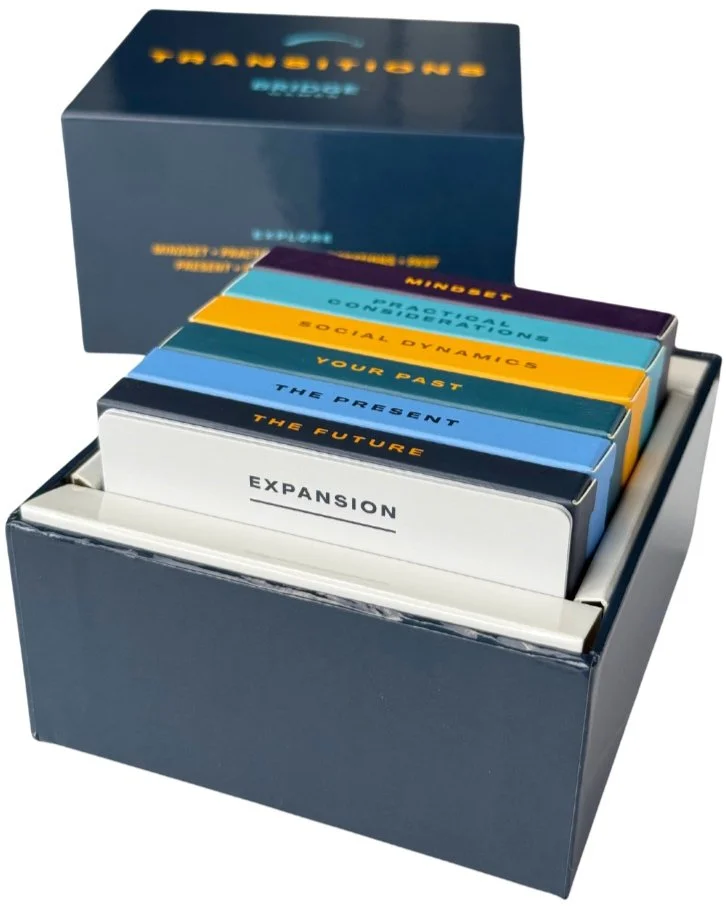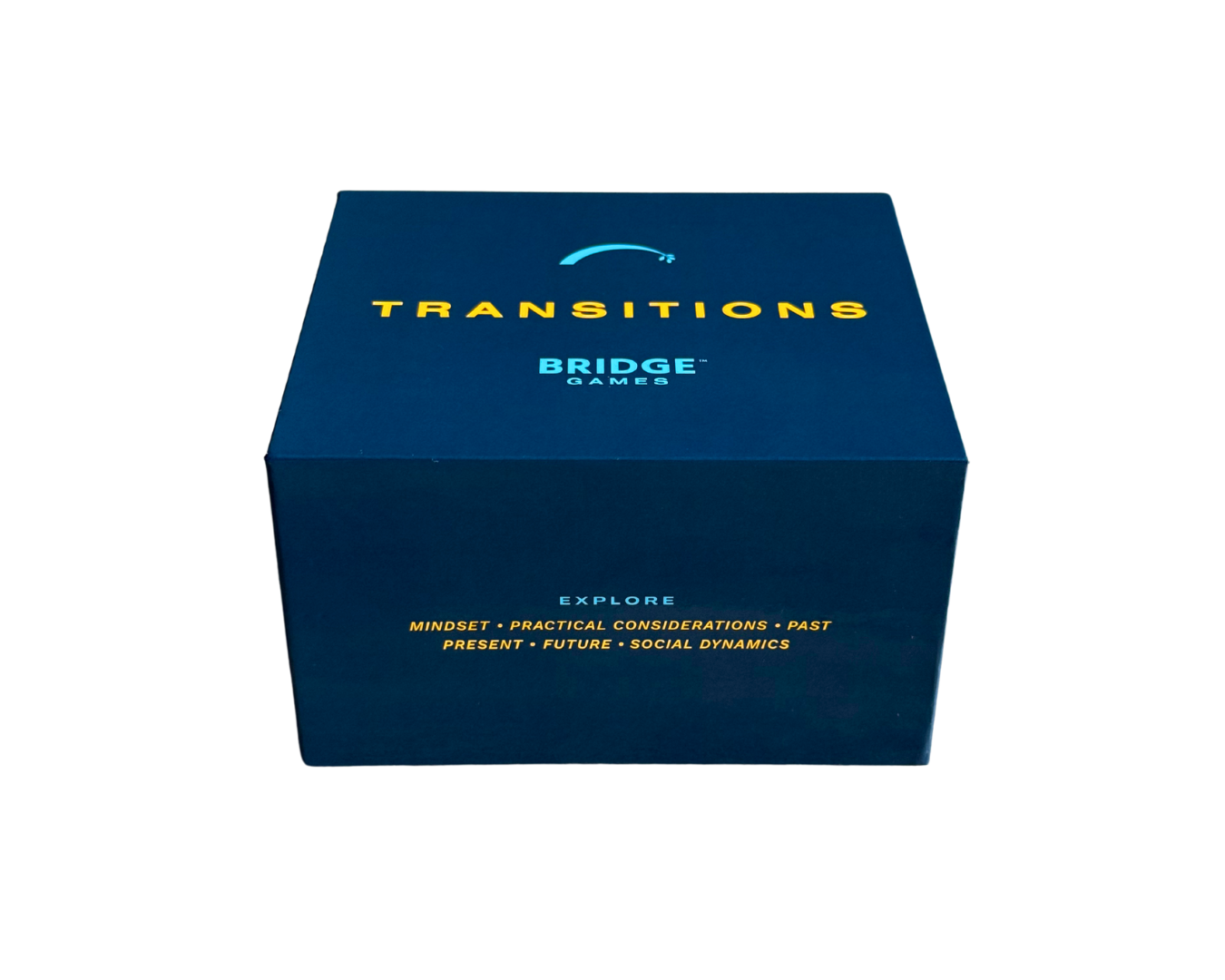 Exclusive lifetime access to an ever-growing library of digital extras—think bonus questions, dinner party cheat sheets, fun ways to remix the game, and more—to keep your Transitions experience fresh, flexible, and full of connection!