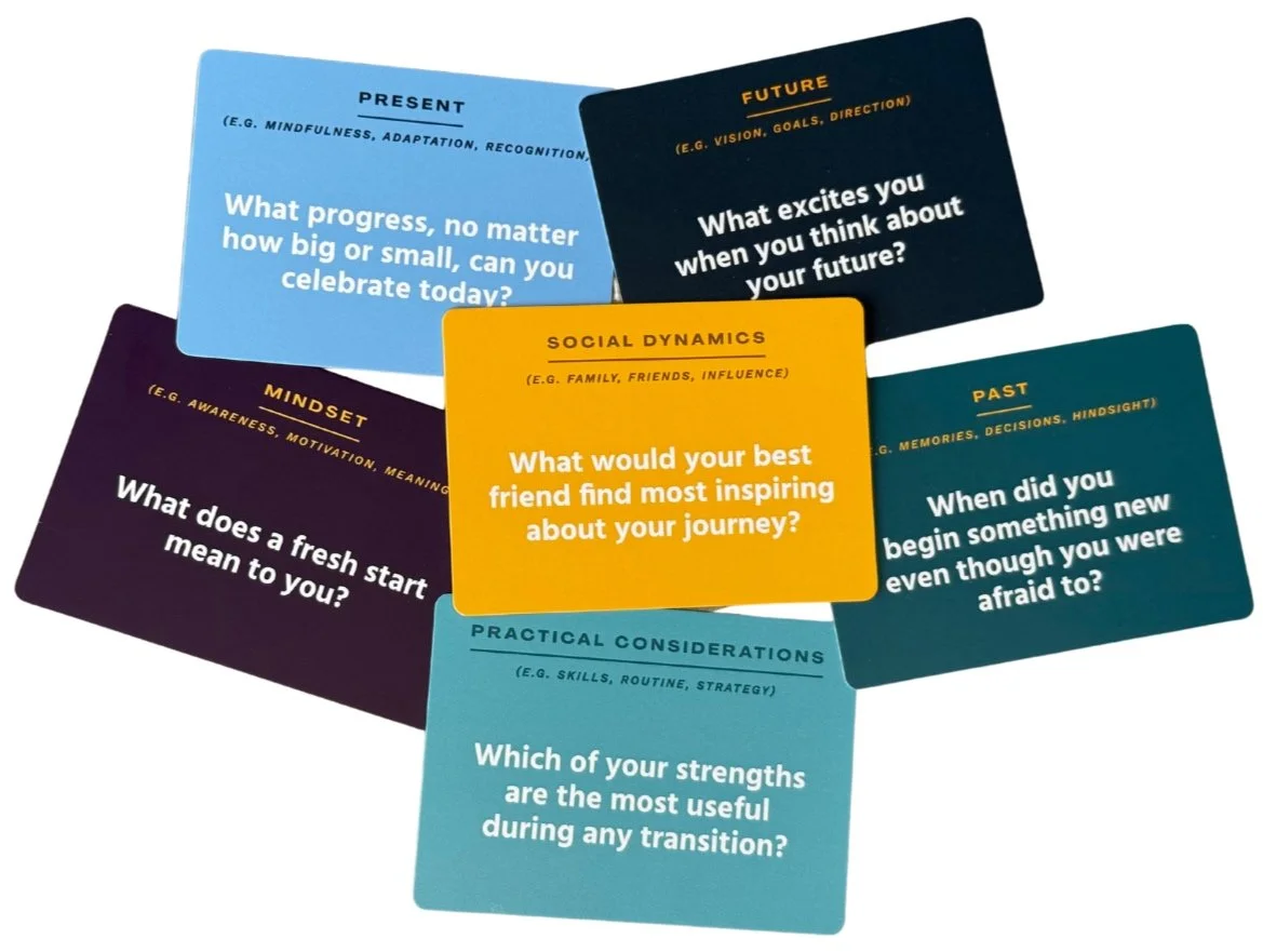 Transitions is a conversation card game designed to help you navigate life’s pivotal moments with curiosity, connection, and intention. Whether you’re navigating a shift or simply craving deeper conversations, these cards invite meaningful dialogue, spark self-reflection, support adaptive thinking, and create space for honest connection—within yourself and with others.